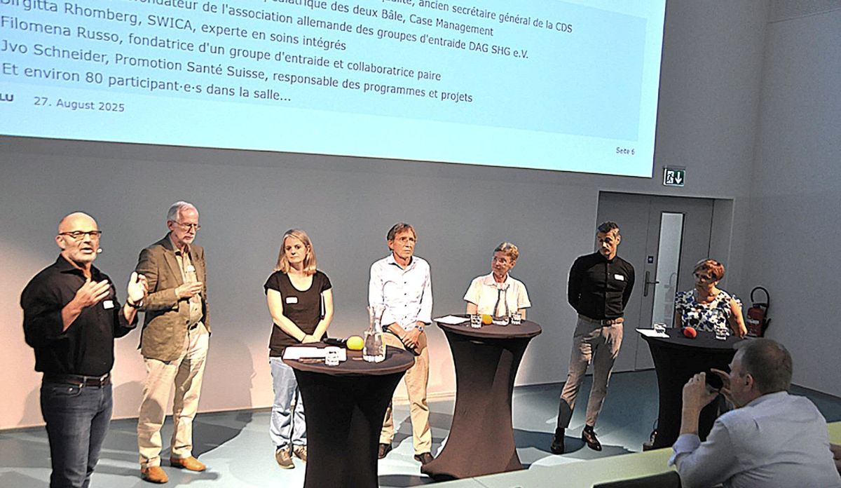 An einer Fachveranstaltung von Hochschule Luzern und Selbsthilfe Schweiz vom 27. August 2025 wurden nicht nur diese Evaluationsergebnisse präsentiert (Prof. Suzanne Lischer, Manuela Eder, Elina Lehmann) , sondern auch acht Best Practice Beispiele von lokalen Kooperationsteams vorgestellt. Jürgen Matzat (Uni Giessen) zeigte in einem Referat die Geschichte der Selbsthilfebewegung auf und ordnete ihre aktuelle Bedeutung aus internationaler Perspektive ein. In einer Schlussrunde diskutierte ein hochkarätig besetztes Podium (im Bild: Moderation: Prof. Oliver Kessler, Gäste: Jürgen Matzat; Patrizia Kasman, Universitäts-Kinderspital beider Basel; Michael Jordi, Präsident Eidg. Qualitätskommission; Birgitta Rhomberg, SWICA; Jvo Schneider, Gesundheitsförderung Schweiz; Filomena Russo, Selbsthilfe-Erfahrene) die zukünftige Bedeutung der Selbsthilfe für das Schweizer Gesundheitswesen.
